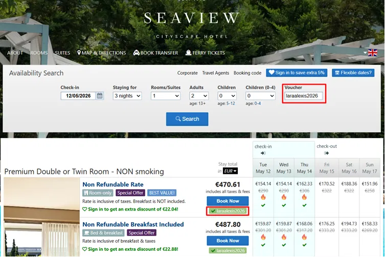 The code is valid only for bookings made on the hotel’s website, for a minimum stay of 2 nights. The code is valid until March 12, 2026.